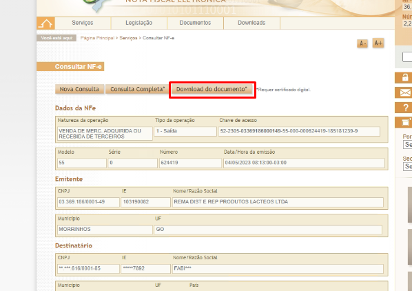 3° PASSO: após consulta da a nota, vai clicar no canto superior em download do documento, conforme a imagem abaixo