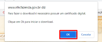 Após pressionado o botão download vai aparecer no meio da tela que é necessário um certificado digital para download do documento, sendo assim clique em ok.