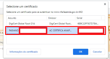 Depois de clicar em ok vai aparecer uma tela com os certificados digitais instalados na sua máquina, sendo necessário selecionar o certificado que informe o cnpj ao qual foi destinada a nota, no caso o certificado do cnpj da empresa.