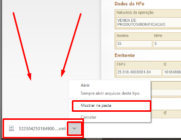 4° PASSO: depois de selecionado o certificado, será feito o download do arquivo XML, que se encontrara no canto inferior esquerdo. Após o download completo clicar na setinha que fica junto do arquivo baixado e clicar em mostrar na pasta para saber a localização do documento, segue o exemplo na imagem abaixo.